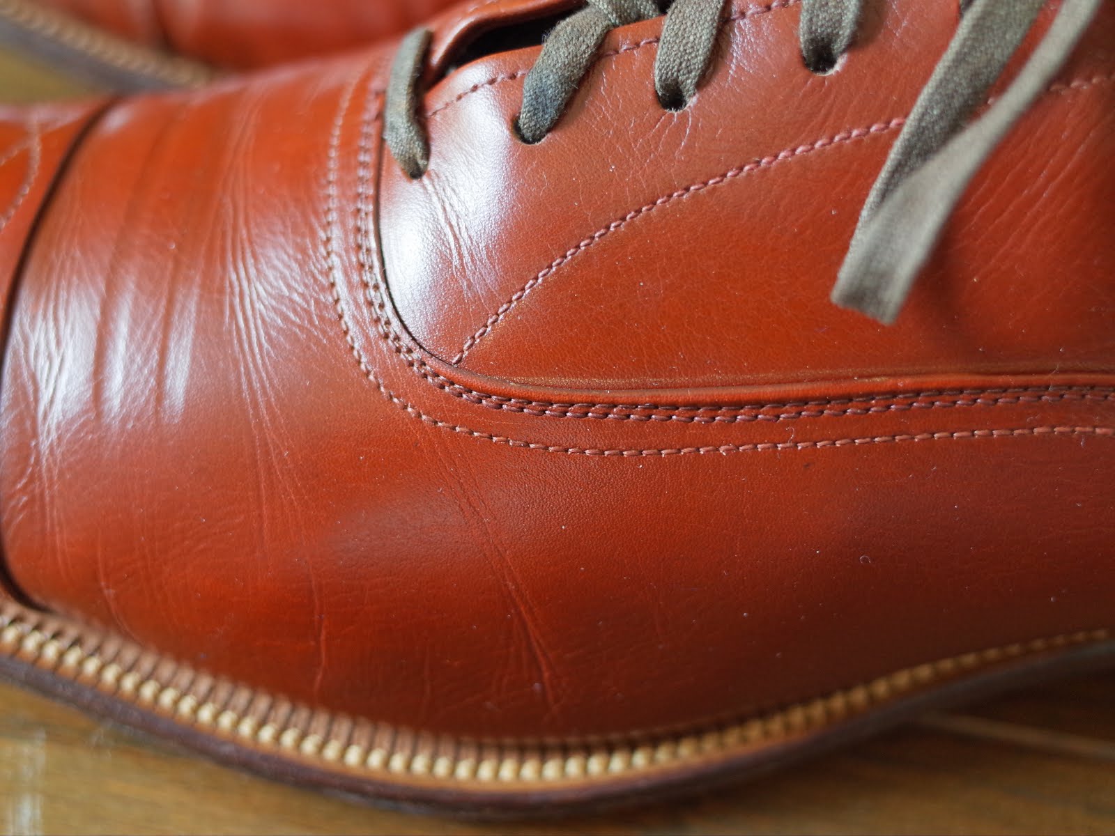 この手のキャップトゥによくある、凹みがありますがシワは全く沿ってないですねwこれシワつけ用だとすると…です^^;