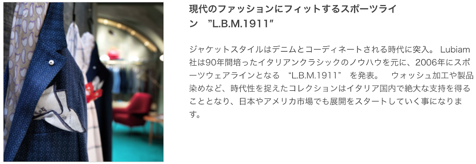 イタリアンクラシックの本流を走り続けるLubiam社。 100年以上の歴史を誇りながら今なお進化し続ける老舗ファクトリーは、新たな世代への引継ぎが完了し、そのスピードはさらに加速。Lubiam社の中で一番ファッションを感じさせるスポーツライン  「 L.B.M.1911 」  からは、クラシックの枠を超えた良質なジャケットが今シーズンも提案されています。   コットンやリネンなどのナチュラルな素材にナイロンやストレッチ素材をミックスしたハイブリッド素材を多用。 製品染めを行う事で他では手に入らないスモーキーで味のある カラー に仕上がっています。 また、今シーズンのコレクションには大胆な柄物も多く展開。 派手になりがちな柄物同士をあえて組み合わせながら、ナチュラルカラーでまとめる事でシックでインパクトのあるコーディネート提案をしています。  今シーズンのジェンテではジャケットとジレをバリエーション豊富に展開。 様々なコーディネートをお楽しみいただける品揃えとなっています。今後の展開にぜひご期待ください。