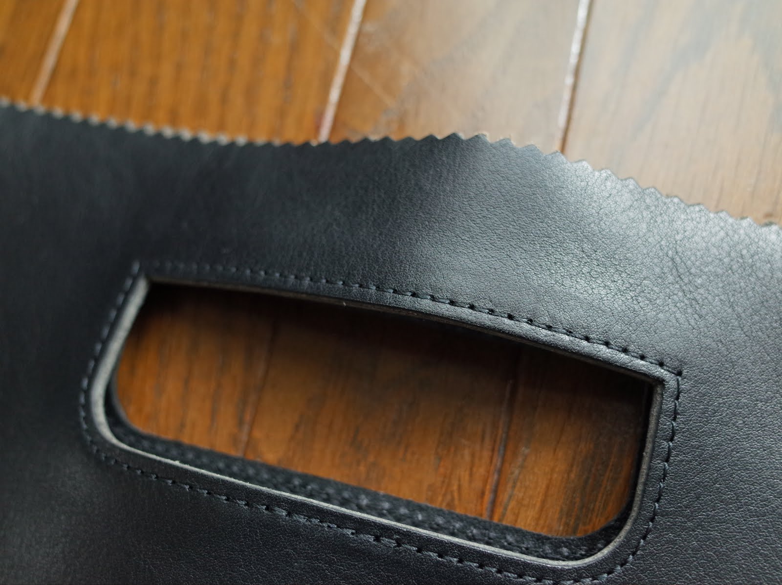 持ち手のアップ。革は厚みがしっかりあるのですが、持ち手、としては厚みが足りないので、クラッチとして持つのが良さそう。