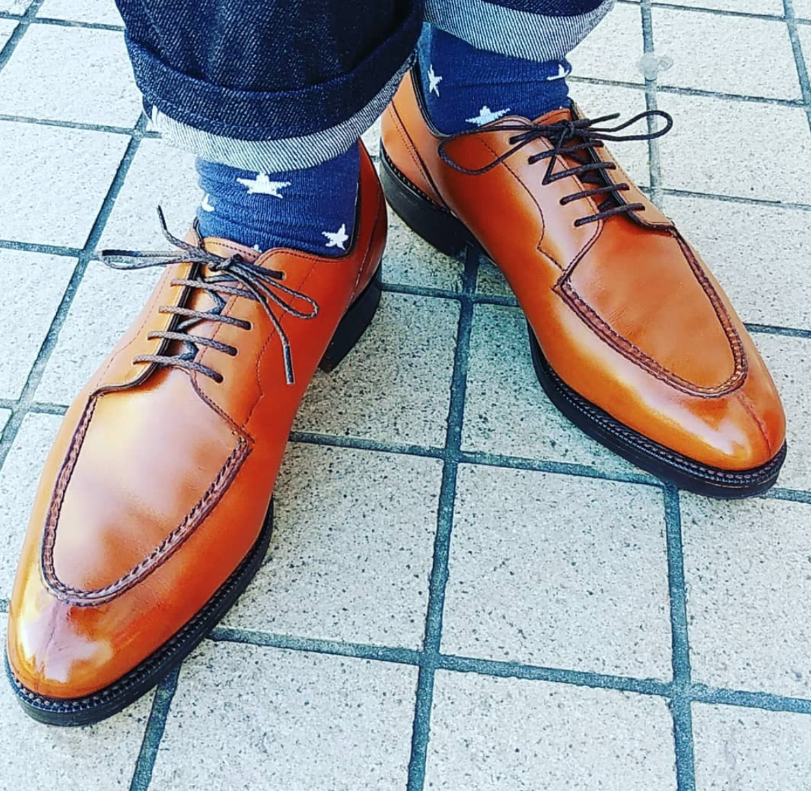 細いラストなのでドレッシーに合わせるのももちろん良いのですが、元はカントリーシューズとされるUチップ、またFUMED OAKという明るいカラーということもあり、細身のデニムに合わせてカジュアルにも履いています。