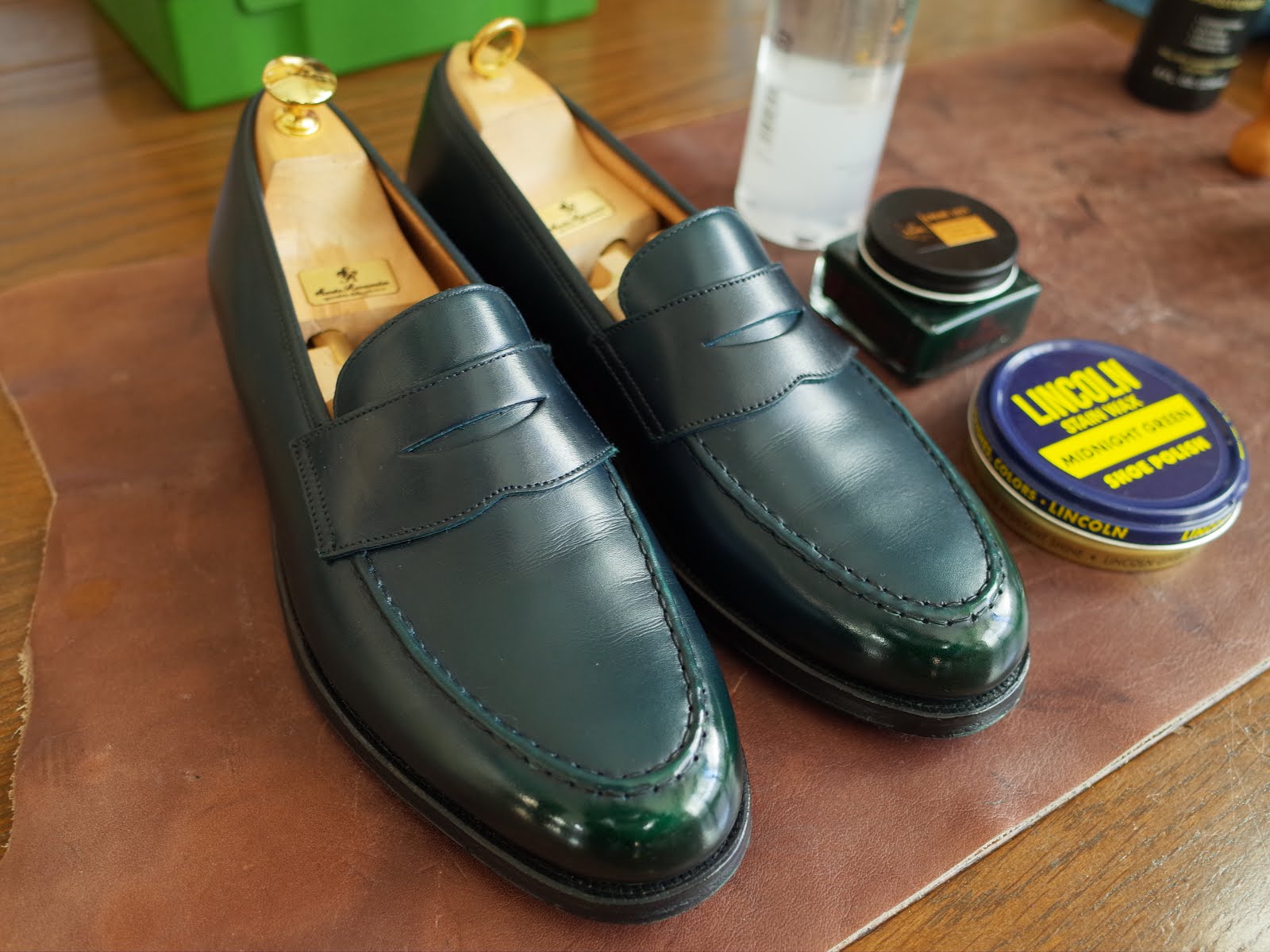 今回磨いたのはクロケットのBOSTONです。だいぶ暖かくなって来たので、ローファーを引っ張り出しました。Tomorrow Landの別注品で青緑、というのが一番近いカラーです。この写真だとだいぶ青が強く見えてますが、もう少し緑がかっています。