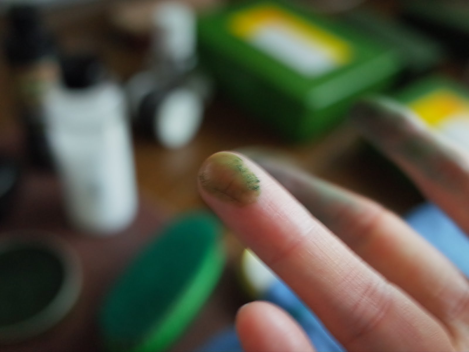 手にとってみると思っていたよりも明るいグリーン。ビーズワックスよりも若干硬いですがそこそこ柔らかく取りやすいですね。一度練ってから使えばもっと使いやすいかも。
