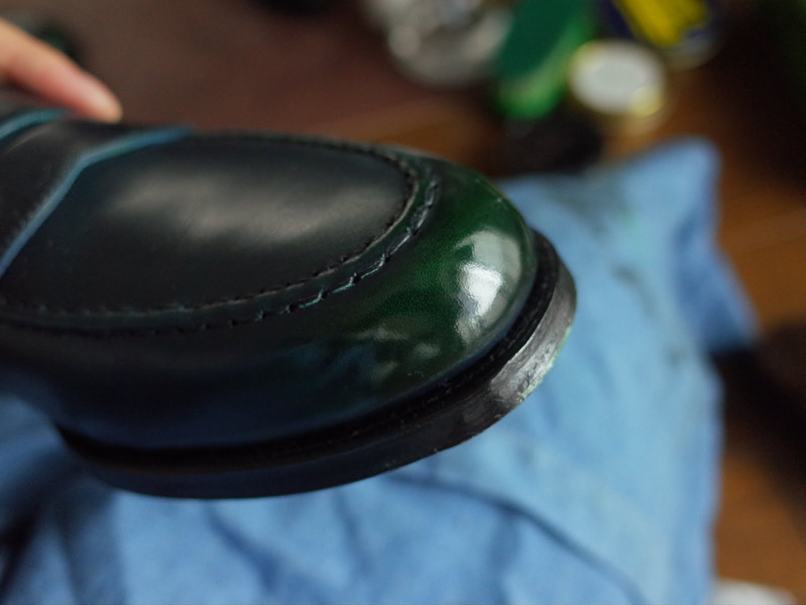 撮影の時間が異なるので、こちらの方が実物に近いですが、トゥもしっかり光ってますね。ビーズワックスとミラーグロスの中間みたいなワックスで、もっと重ねて磨けば十分反射してくれる、そして乾きやすくて使いやすいワックスだなと感じました。