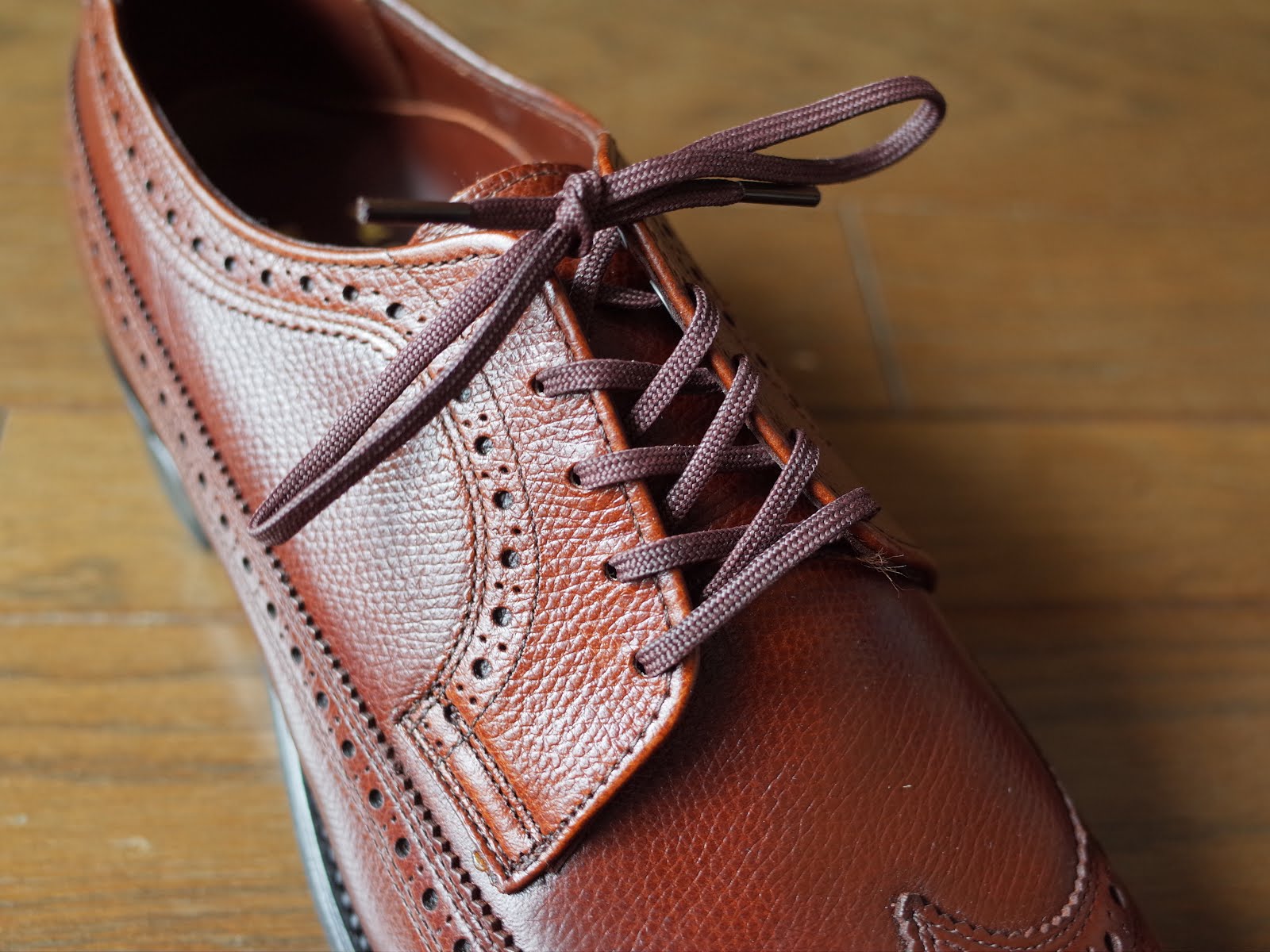 ケンムーアなんかと比較するとメダリオンの穴径は小さく、またトゥも細めの印象。ステッチはダブルで、ピッチはそこまで細かくなく少しずつコストダウンの波に押された形でしょうか。そう言った細かな面では時代を表しているものの、良くある羽根の部分の継ぎ目はなく、とても丁寧に作られている印象です。どことなくリーガルに近いかも。出し縫いもかなり綺麗に縫われています。