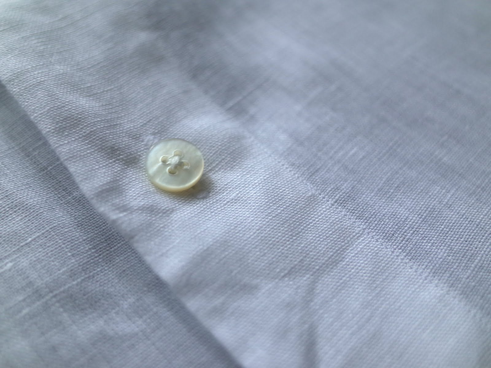 ボタンは白蝶貝の1.2mm厚。薄めのボタンの方がこのシャツには合うと思うのでばっちりかと。