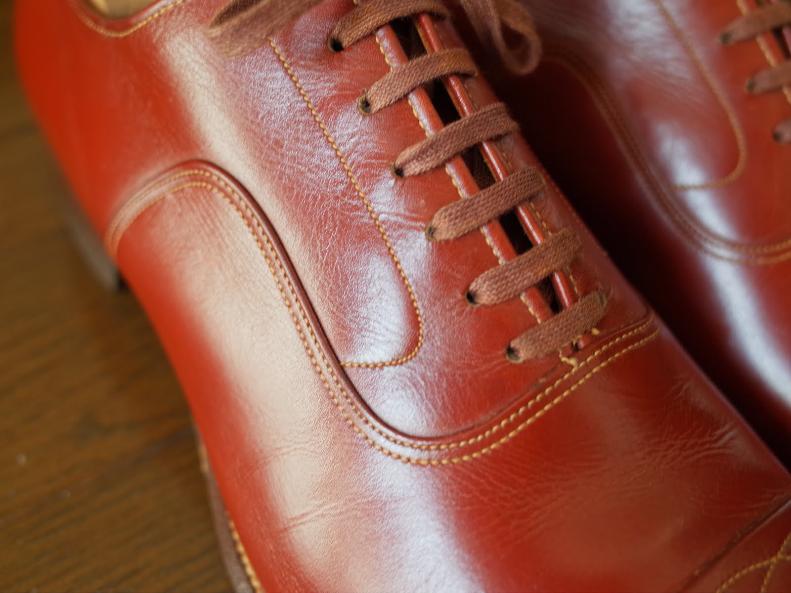 狭小生成りステッチの7アイレット、さらにはこの独特の赤みのあるレザー。