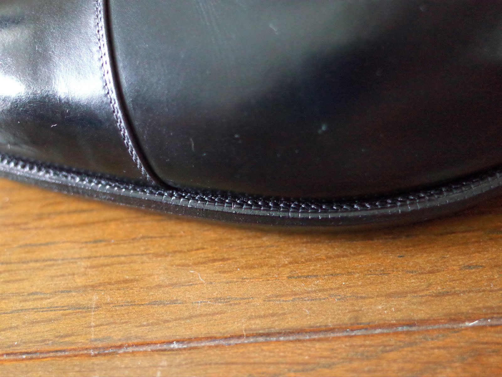 次は出し縫いです。コバはかなりせめられており少し見にくいですが、ピッチは1mmととても細かくしっかり縫われています。ファジングもさりげなく入れられています。アッパーのステッチはそこまで細かくないですが、ダブルで互い違いで縫製。
