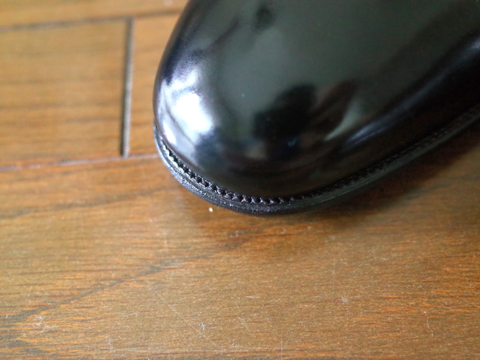 次は出し縫いです。コバはかなりせめられており少し見にくいですが、ピッチは1mmととても細かくしっかり縫われています。ファジングもさりげなく入れられています。アッパーのステッチはそこまで細かくないですが、ダブルで互い違いで縫製。