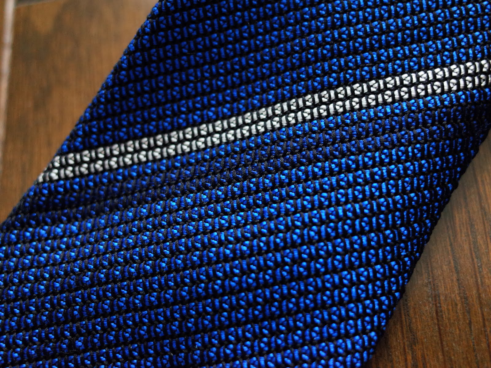 少々分かりづらいですが、一番の特徴だと思っている生地。肉厚なシルクで平坦な生地ではなく立体感があるので光の当たり方によって色味が違って見えます。他のネクタイにはない存在感です。