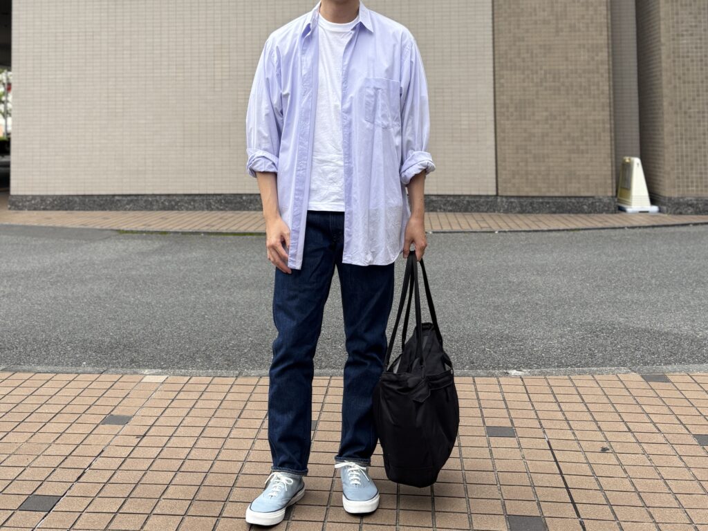 ジーパンに白シャツかTシャツでシンプルに合わせるのが王道ですが、サッとシャツを羽織ってもいいかと思います。また、ジーパン以外にもチノや軍パンも合うでしょうから、万能選手です。白パンにボーダーTシャツでマリンルックも良さそう。いずれにしても夏の前後に大活躍する色味です。