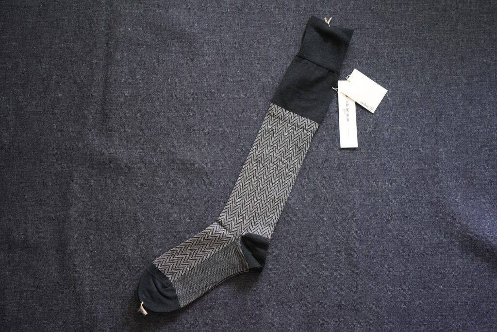 もう一つのロングホーズはブラックのヘリンボーン。どうやらレアらしく。確かに他ではみたことないですね。ロングホーズも締め付けは程よく、つま先のリンキングも美しく処理され、全く違和感を感じないソックスです。買ってよかった。こちらも別途ご紹介できればと思っています。