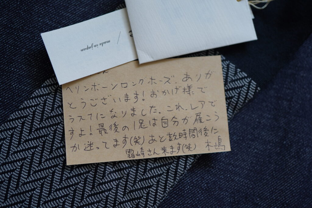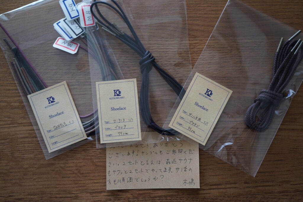 茶と黒、それぞれ一本ずつ頼んだら色サンプルもまとめて送ってくださって。しかもめちゃくちゃ早い。オーダーなのに。頼んだらすぐ発送されている感覚。いつも木嶋さんは直筆のメッセージカードをつけてくださるのですがそれがまた嬉しいですよね。靴紐も今後は木嶋さんにお願いしようと思っています。
