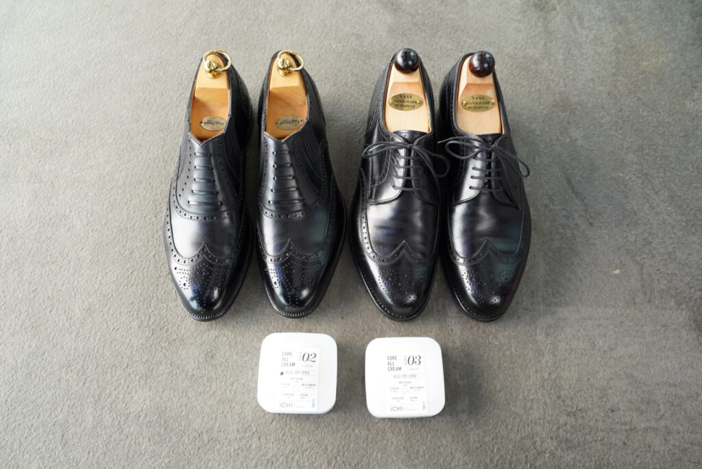 順々に、モイスト、ディープブラックで磨いて乾拭きをしまくった後を示していますが、しっかりと黒く、そしてしっとりと。革の状態もしっかりリカバーできます。この二つがあれば黒靴は万全。