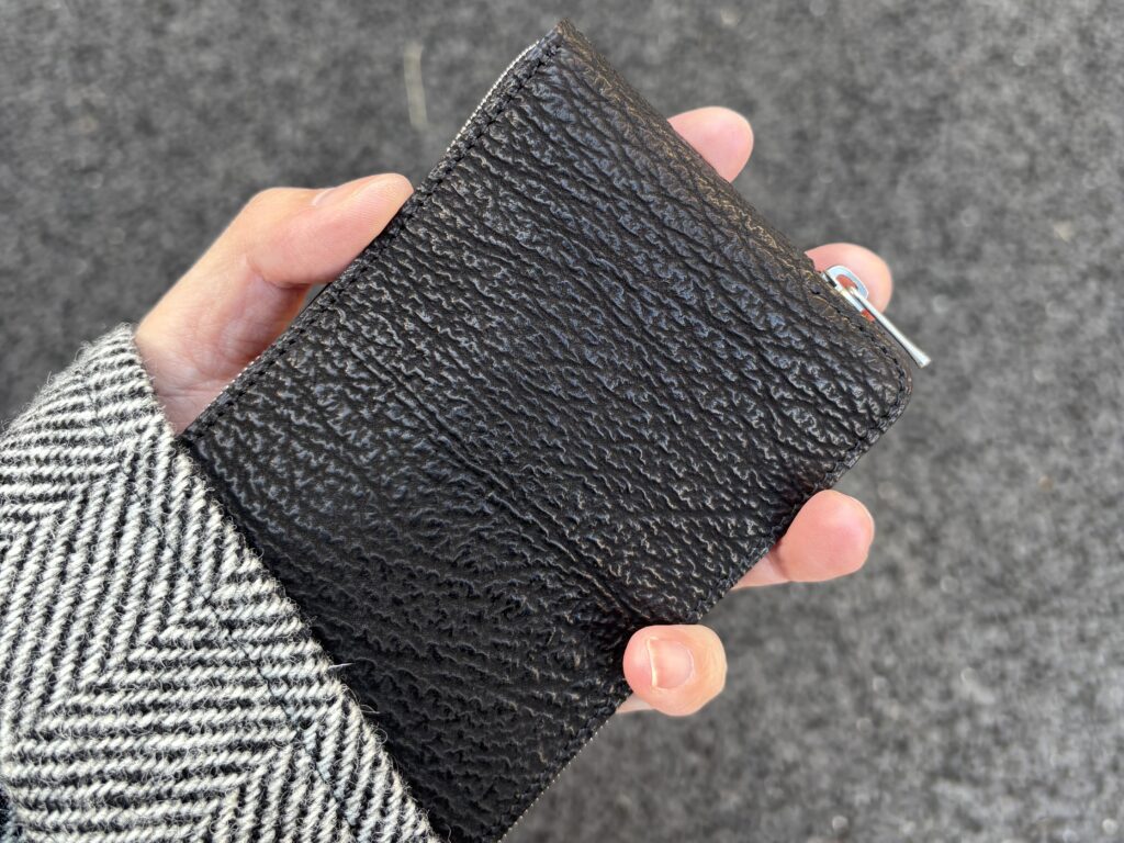 シャークスキンのエイジングは、最初はマットながらも表面が徐々に平滑になり、シボの凹凸の陰影がよりくっきりしてくるんだとか。毎日手にとるものなので触り心地含めて今後が楽しみな一品になりました。