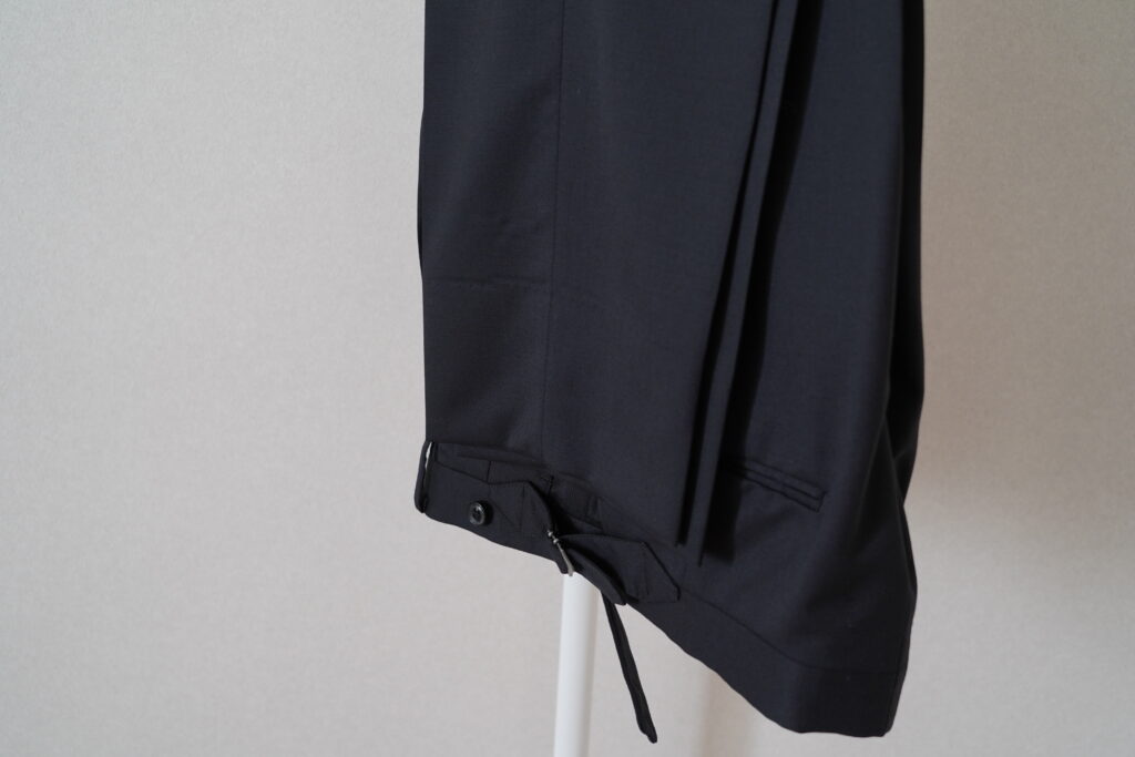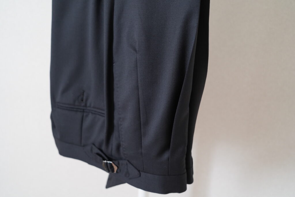 パンツは2アウトプリーツのベルトレス、サイド尾錠付き。冠婚葬祭用ですので裾はシングルで合わせてもらいました。裾幅はおおよそ20cm、飽きのこない中庸な太さでまさに冠婚葬祭のこれ一着を長い期間着る、というのにぴったりな作りです。