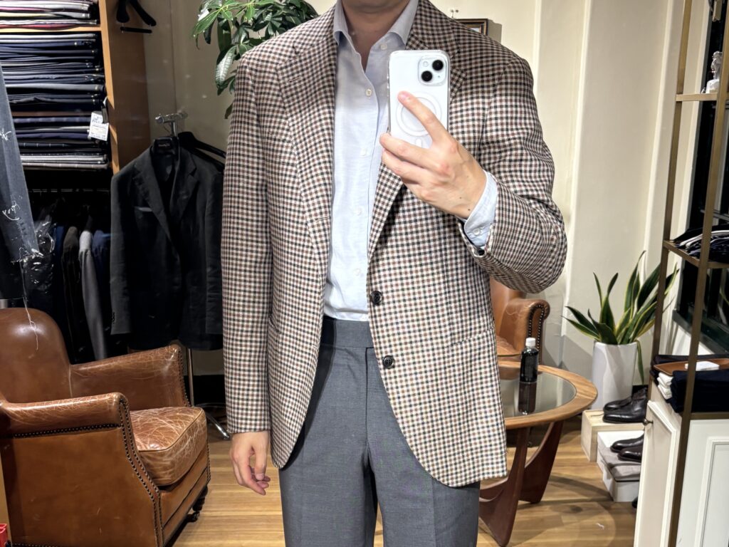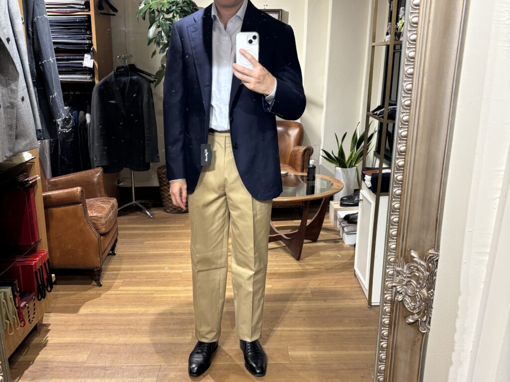 アトリエにある48サイズのRTW、ガンクラブチェックとネイビーのホップサックジャケットを試着させてもらって。数ベージュのチノパンも気になっていたのでこちらも試着。うーん、たまらん。特にベージュのチノはRotaなどにも全く引けを取らない素晴らしいシルエット。この日は購入しなかったのですが追って購入しました笑。