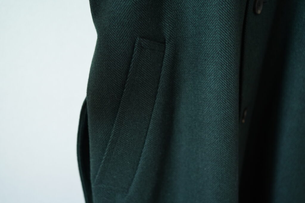 ゆったりのシルエットでありつつ、明らかなオーバーサイズ、変にだらしなく見えたりすることもない、計算されたパターン。一枚袖の綺麗に落ちる方から袖先のライン、どこも角を感じることのない柔らかいコート。
