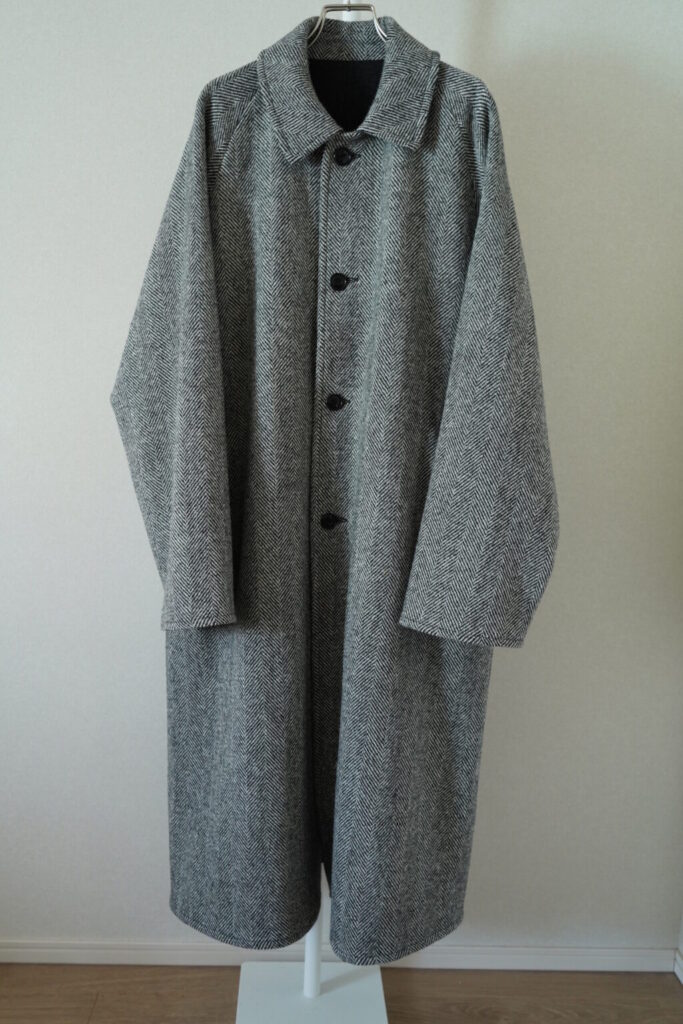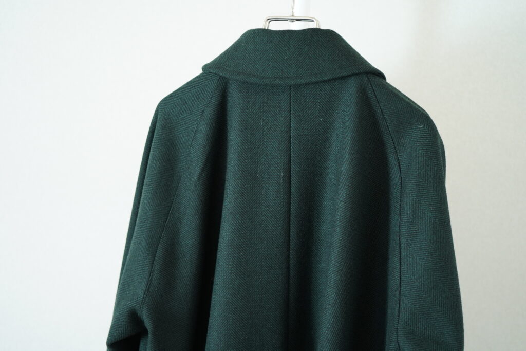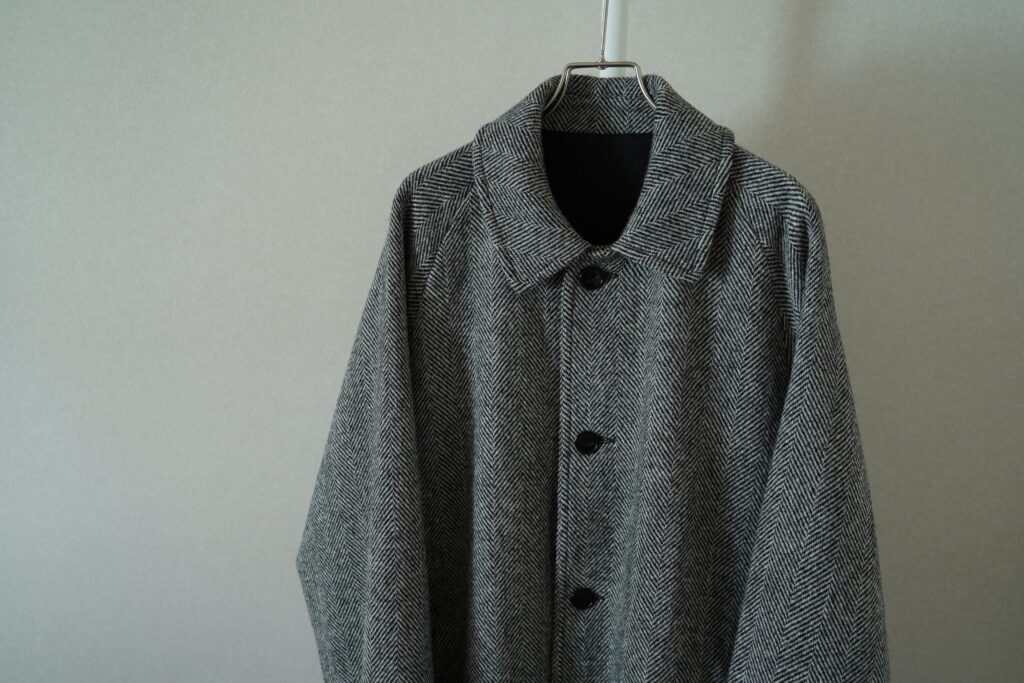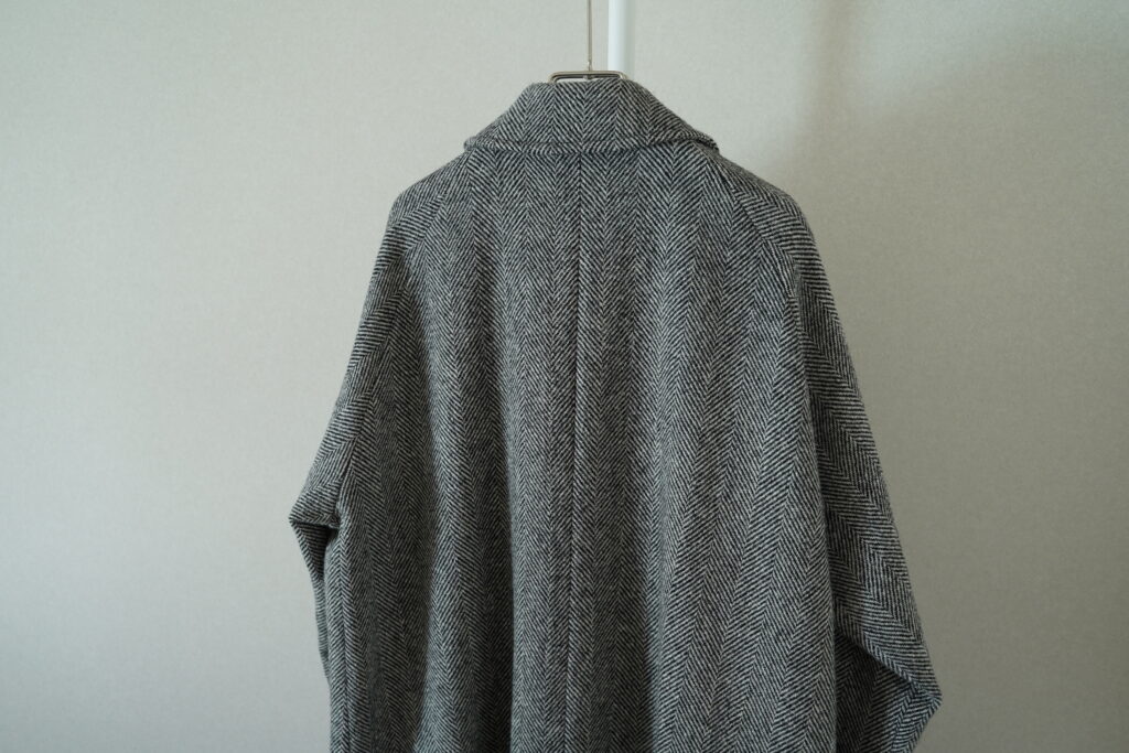 基本的な一枚袖のラグランという点はもちろん変わらず。こちらはベルトなしでよりばさっと羽織る感覚が合いそうなコート。もちろん裏地は葛利毛織のウール。このハリスツイードのヘリンボーン、畝の幅が広い。あとボタンが猫目ボタンなのも面白い。