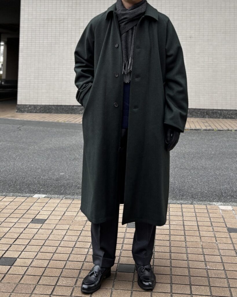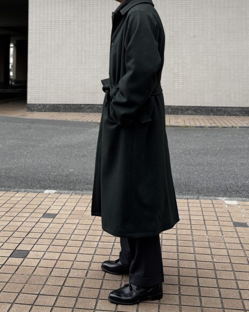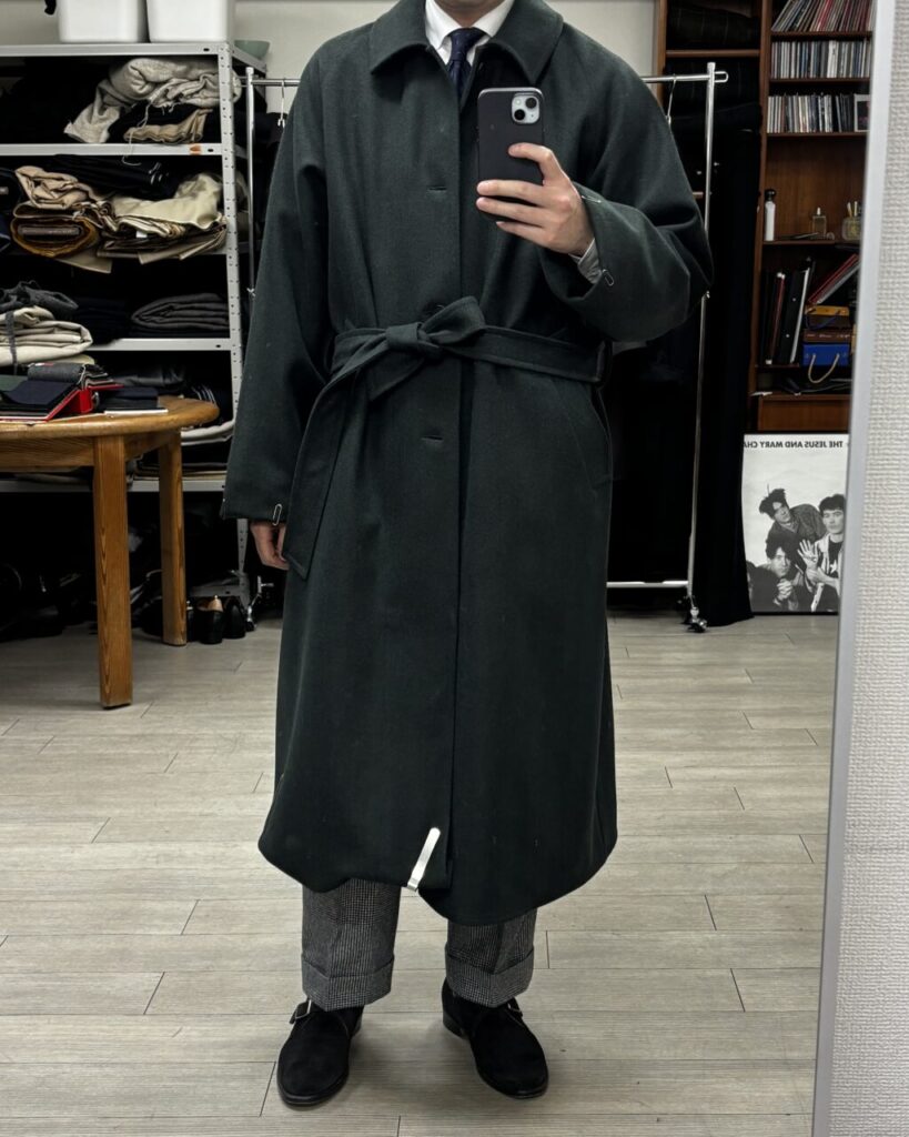 ラックにかかっていたマイフェイバリットカラー(言い方!?)のグリーンのコートが目に留まりました。ハリソンズから、こちらもヘリンボーン織のダークグリーン、色がたまらん。こちらはベルト付きで変化を楽しめる。