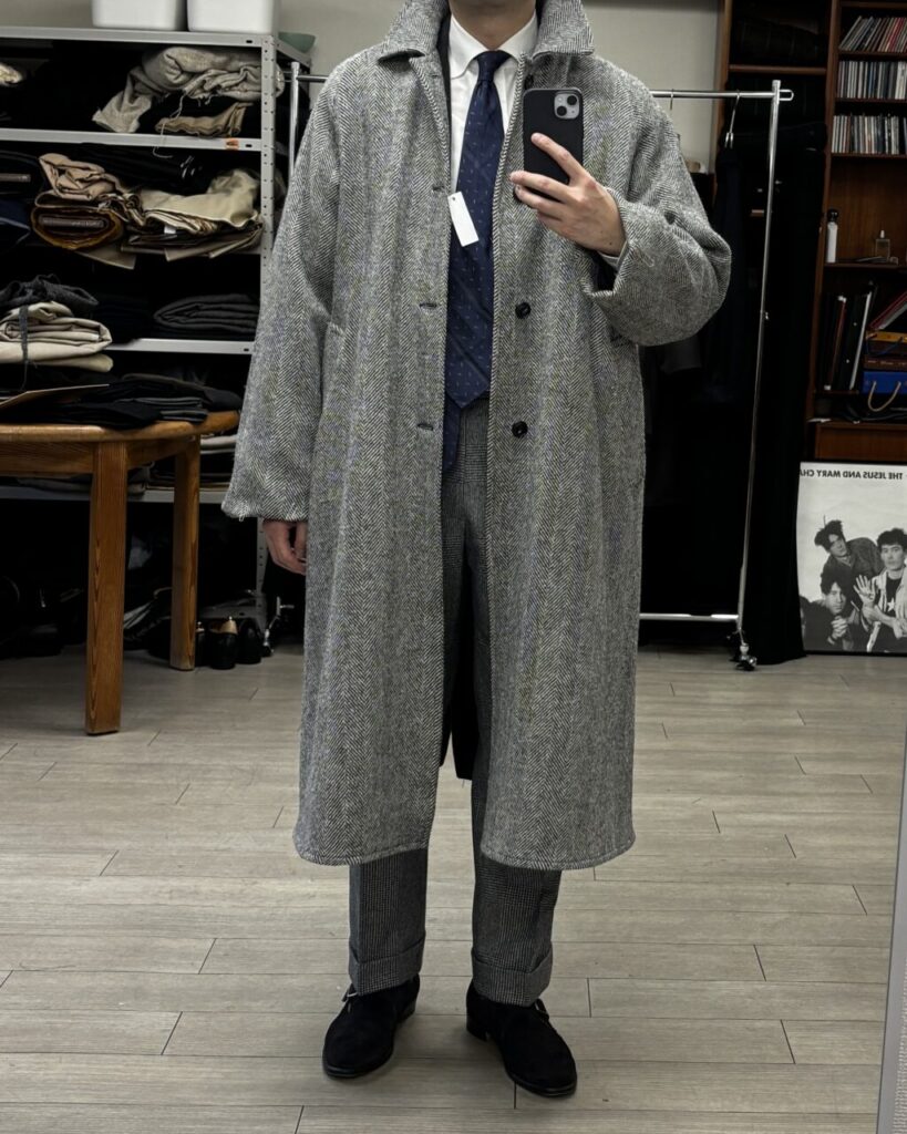 お目当てだったのはハリスツイードのヘリンボーンコート。これぞオーバーコートというサイジング、ジャケットの上から難なく着用できるサイズ感。ベルトなし、袖のストラップなどもなし、非常にシンプルで飽きのこない作り。価格もかなり手頃でこれは間違いないと思っていたのですが…