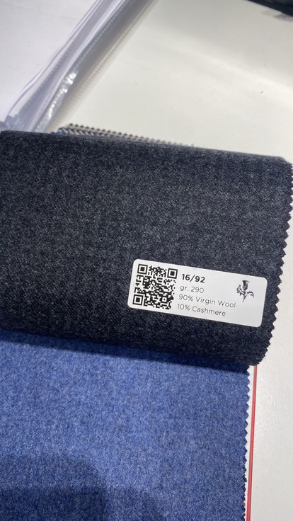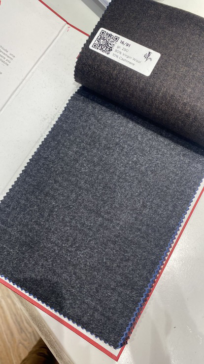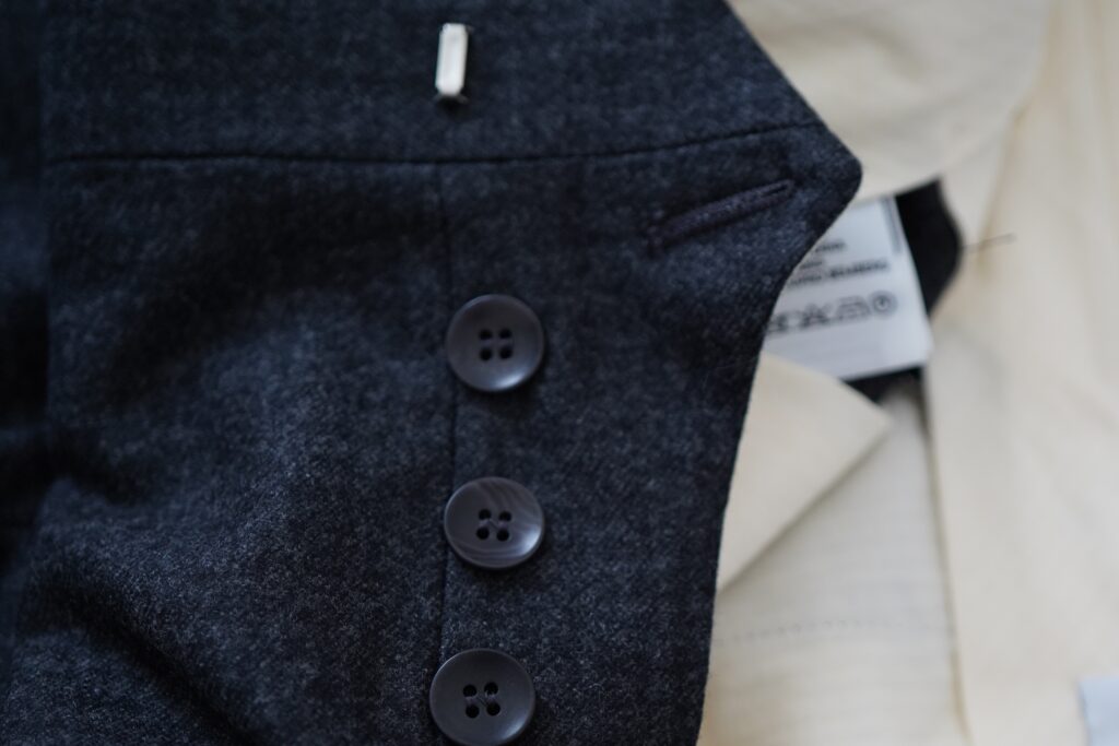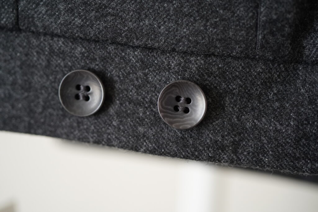 生地はPIACENZA、ウールカシミヤでチャコールとミディアムグレーが織りなす大きめバーズアイ(バーズアイと呼んでいいのかはちょっと疑問。)