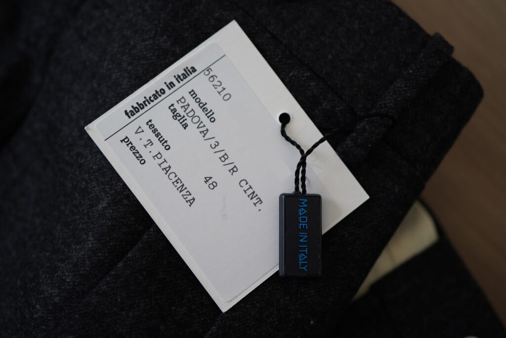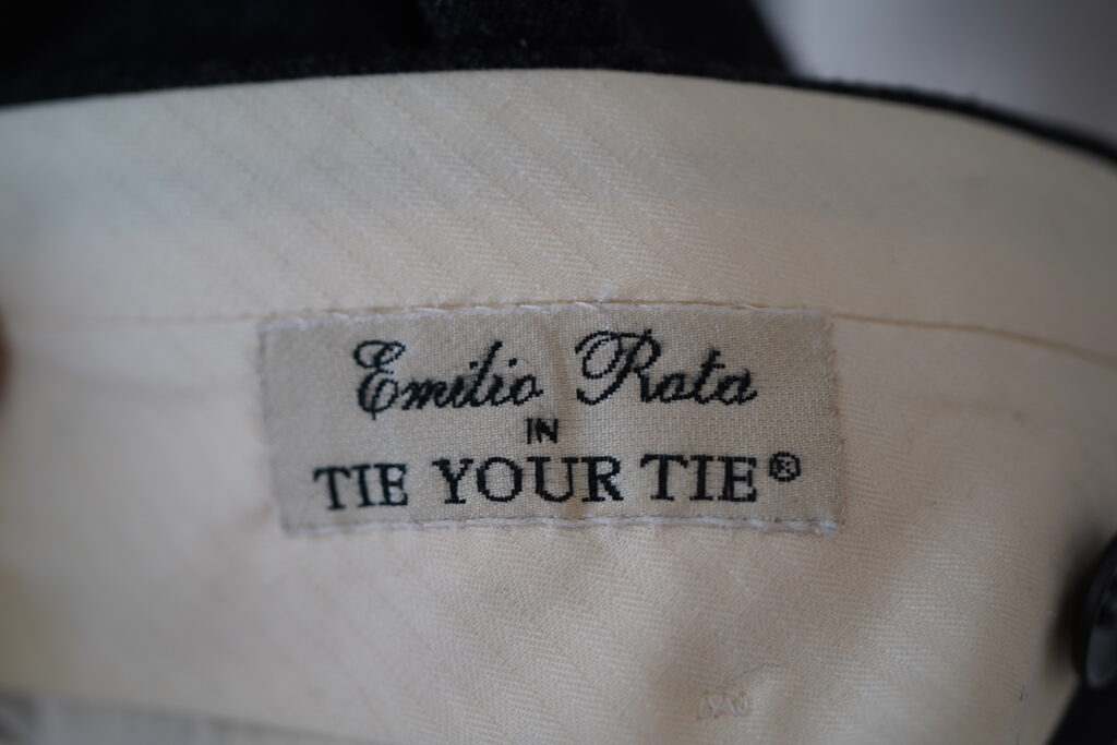 2プリーツの持ち出し長めベルトレス、サイドアジャスターなしのボタン調節版。フロントはボタンフライにEmilio Rota in TIE YOUR TIEのスペシャルなタグ。