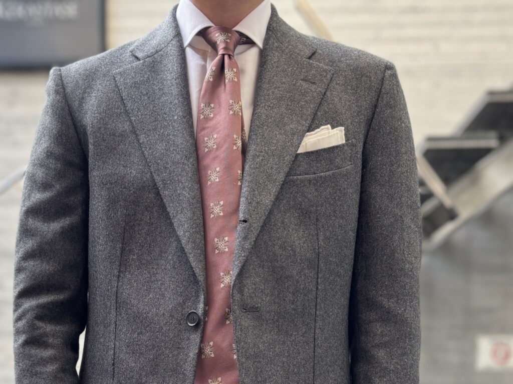 納品いただいた時期は2025年末ということで、冬の時期にしかまだ着られてないですが、冬着られるコットンリネンならオールシーズンも間違いなくいけます。COLのフランネルスーツにAtto Vannucciのタイ。コットンリネンの少し凹凸のある質感がフランネルともマッチ。クリアカットのものよりも表情のあるものの方が合いそうですね。