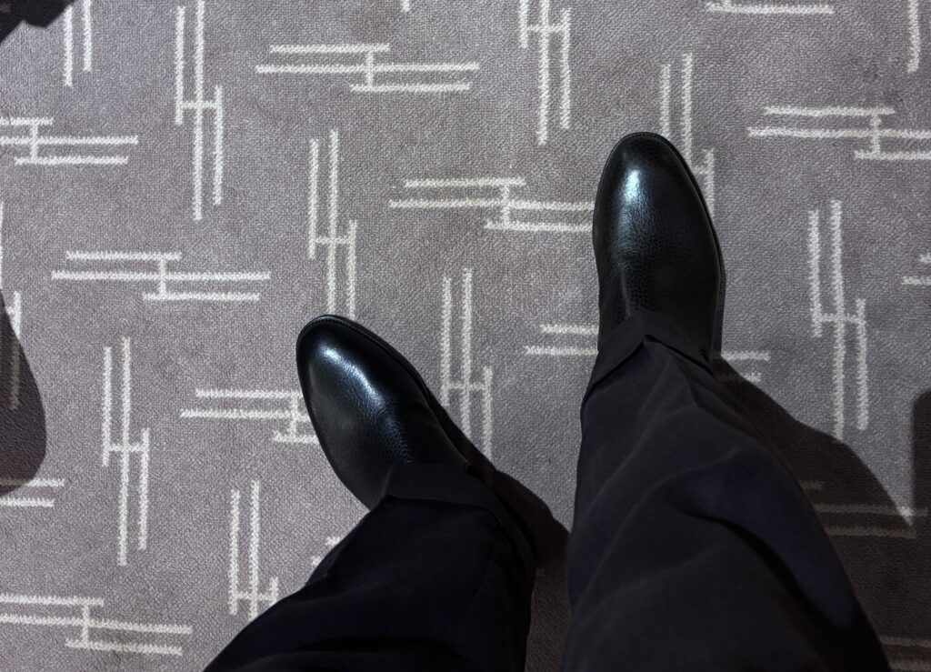 なお、この時は白樫さんとのコラボチェルシーブーツ、STEEL HEADのサンプルも見せていただきました。画像が暗すぎて申し訳ないのですが、私の足にはあっていそうでイングリッシュグレインの質感もたまらなくて。でもチェルシーブーツはちょうど他を手にしてしまったばかりだったことと予算的な側面もあって、今回は断念しました。無念。